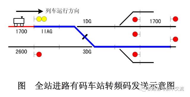 采用全进途发码的车站并存正在转频的列车进途,进途处分并盛开信号后,咽喉区发轨道检测码(27.9Hz),股道发平常码。当列车占用上下行载频分界的绝缘节火线轨道区段,上下行载频分界绝缘节后方轨道区段起先预发送转频码(25.7Hz),该轨道区段解锁后,复原发轨道检测码。如图所示接车进途,1DG轨道区段占用, 3DG轨道区段起先发送转频码,3DG轨道区段解锁后复原发送轨道检测码。